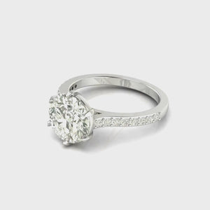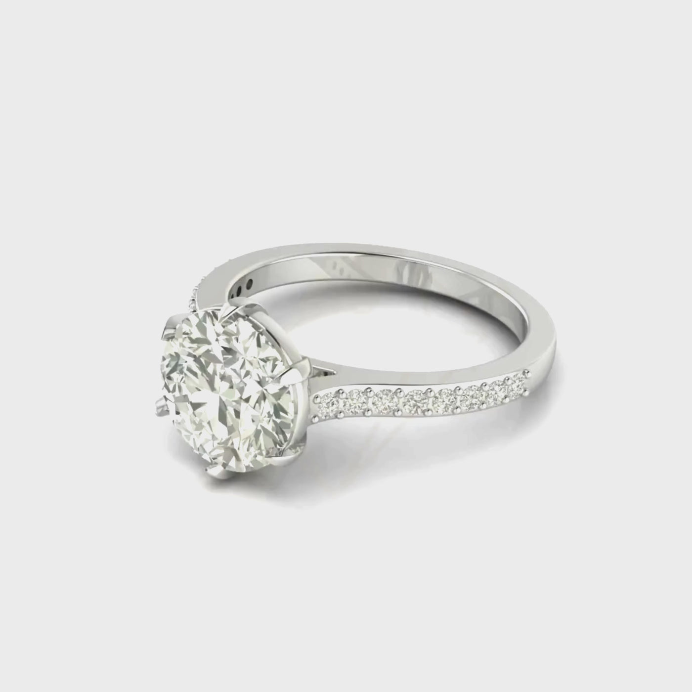 Hand-finished prongs, mirror polish, and perfect symmetry for maximum fire and scintillation. Designed to sit flush with a wedding band and feel weightless on the hand.