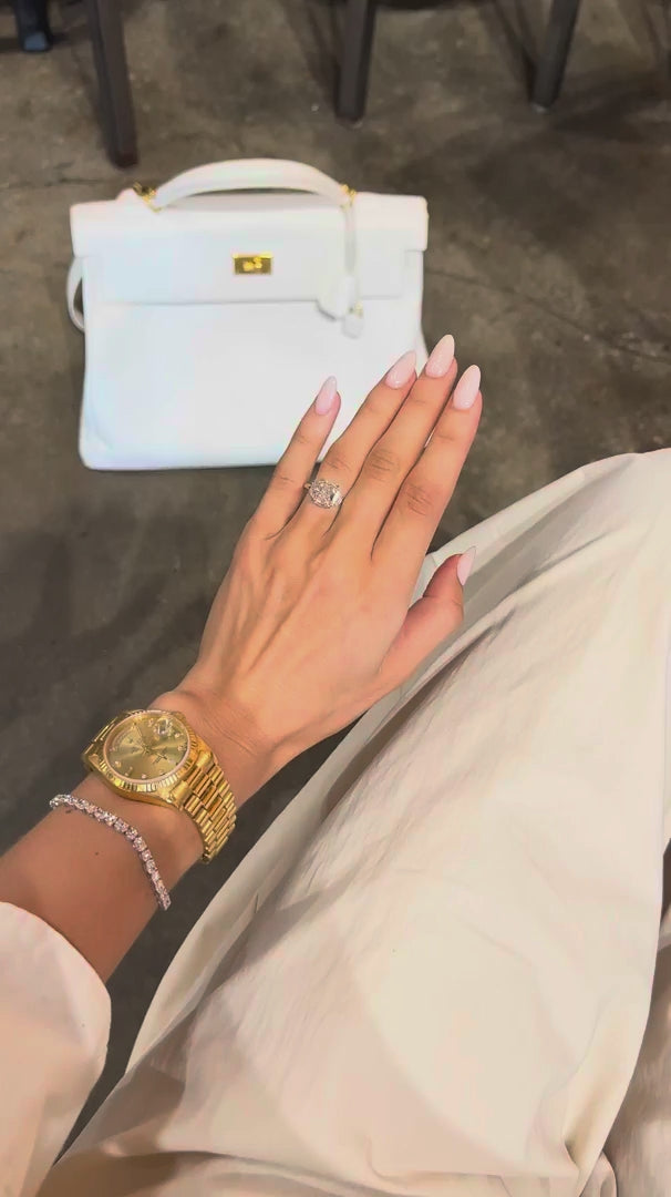 Perfect in pink, this 3.24 carat cushion Camilla with half-moon side stones is perfectly balanced. We think pink lab diamonds are a stellar value compared to their natural counterparts, and this piece is a perfect example of that. To top off the design, this piece is set in a two tone 14K rose and white gold setting, a complimenting metal combination that elevates and embraces the fancy vivid pink center. Please note that a donut will set the stone so low that a traditional wedding band won't be able to stack perfectly flush. Want the best of both worlds with a flush stack and a donut? Contact us about our open bands for a custom fit.
