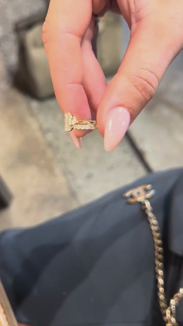 Three stone rings are a classic fan favorite, and for good reason! This timeless Camilla ring features a 1.25 radiant lab diamond, set with dainty pear side stones, a pavé rail, and pavé donut details. Please note that a donut will set the stone so low that a traditional wedding band won't be able to stack perfectly flush. Want the best of both worlds with a flush stack and a donut? Contact us about our open bands for a custom fit.