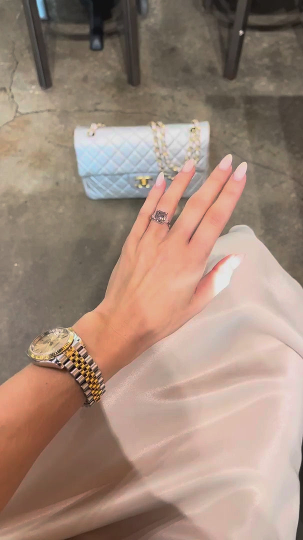 Purple diamonds don't *technically* exist yet, but this 5 carat fancy intense brownish pink radiant appears to be. Set on a 14k white gold 2.2mm solitaire band with heart side stones. Please note that a donut will set the stone so low that a traditional wedding band won't be able to stack perfectly flush. Want the best of both worlds with a flush stack and a donut? Contact us about our open bands for a custom fit.