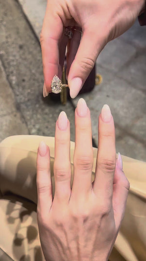 This classic, solitaire setting features a 6.01 carat, pear lab diamond. It's warmer G color perfectly compliments the 14K yellow gold setting for a vintage, hierloom feel. This setting also features a donut and cathedral upgrade - the dream combo when it comes to adding durability and structural integrity. Please note that a donut will set the stone so low that a traditional wedding band won't be able to stack perfectly flush. Want the best of both worlds with a flush stack and a donut? Contact us about our open bands for a custom fit.